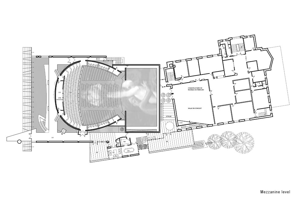 La salle de spectacles et son foyer tiennent l’espace public, tandis que les espaces servants (privés) tels que les bureaux, salles de conférences, et ceux de support à la scène sont en continuité avec l’orientation du Centre Civique. L’opposition des deux trames du projet produit un espace inédit. Un atrium de double hauteur, qui deviendra le lieu privilégié de rencontre des étudiants et des professeurs du conservatoire, de l’école de danse et des usagers de la Salle de spectacles.
