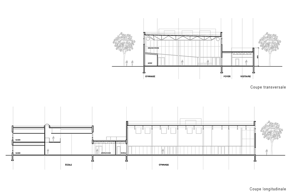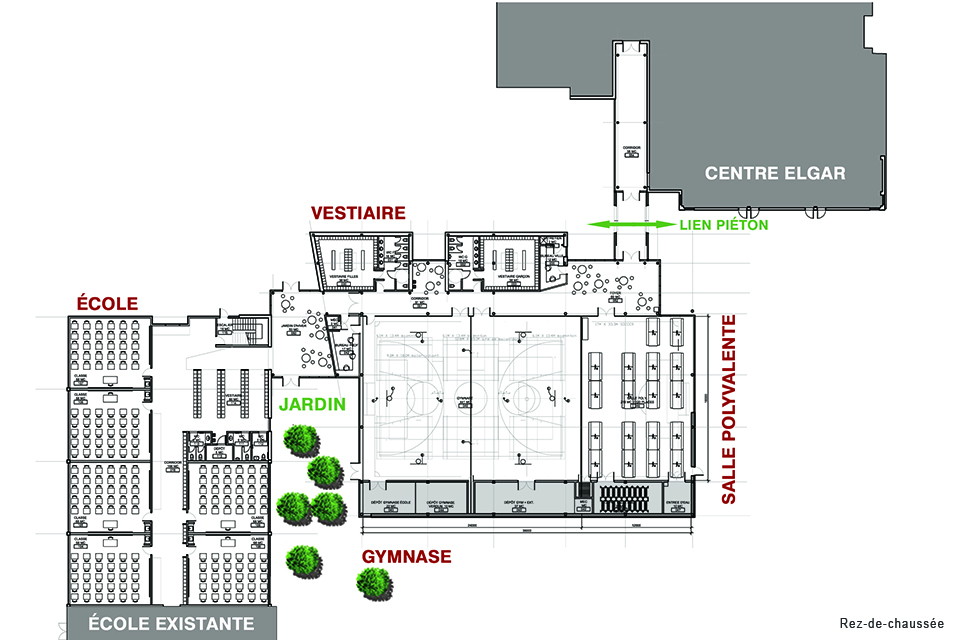 Le programme de cet agrandissement se divise en deux grandes unités, soit un bloc classes de deux étages, prolongeant une aile de l’école existante et un grand gymnase qui peut être aménagé en un, deux ou trois plateaux de jeux. Douze classes et un aire de casiers sont prévu d’un côté et le gymnase de l’autre avec un jardin d’hiver entre les deux. Un lien piétonnier intérieur autorise la connexion de cet ensemble avec le Centre culturel. Différentes possibilités d’accès et de contrôle sont aussi aménagés afin de permettre ou non les accès publics et plus privés liés à l’École. Un partage de la bibliothèque et de la piscine voisine est offert à l’école primaire.