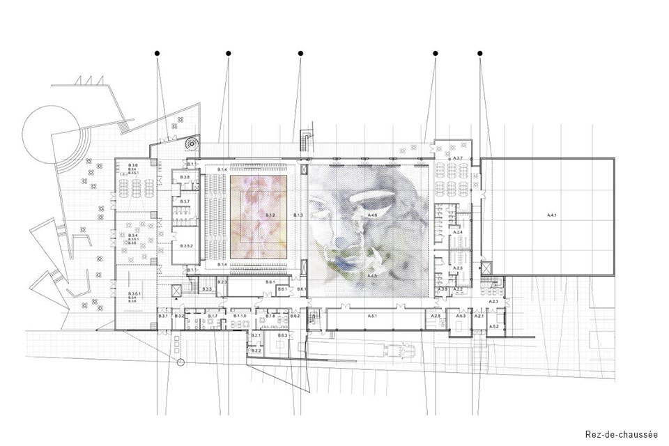 Du point de vue de l’aménagement, des « tranchées » transversales au site viennent moduler l’ensemble du bâtiment-paysage. Chacune de ces ouvertures qualifie et révèle les identités programmatiques, soit l’entrée du Centre de diffusion et son volume d’accueil; l’expression de la scène par le grand écran de projection; la bande de studio d’entrainement en projection en façade; l’entrée de l’école de cirque et la cour. Ce concept paysager se veut tel un marquage de l’espace public au-delà de l’emprise du bâtiment venant ainsi qualifier les relations entre celui-ci, la ville, le parc et le fleuve. Une flexibilité maximale des espaces est également recherchée de manière à permettre une diversité d’occupation des espaces selon les événements.