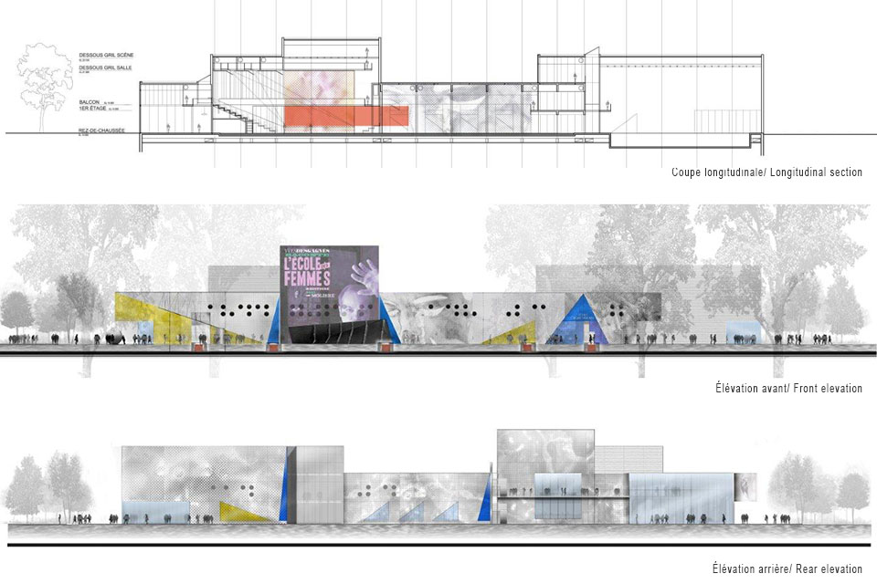Le traitement de l’enveloppe, telle une « peau » animée, se découpe en une série d’ouvertures et de panneaux de céramique colorés. En façade vers la ville, un « écran » unitaire blanc avec des composantes visions et opaques ou semi-transparentes module cette frontalité. Un grand écran d’aluminium perforé domine la composition d’ensemble, dématérialisant le volume.