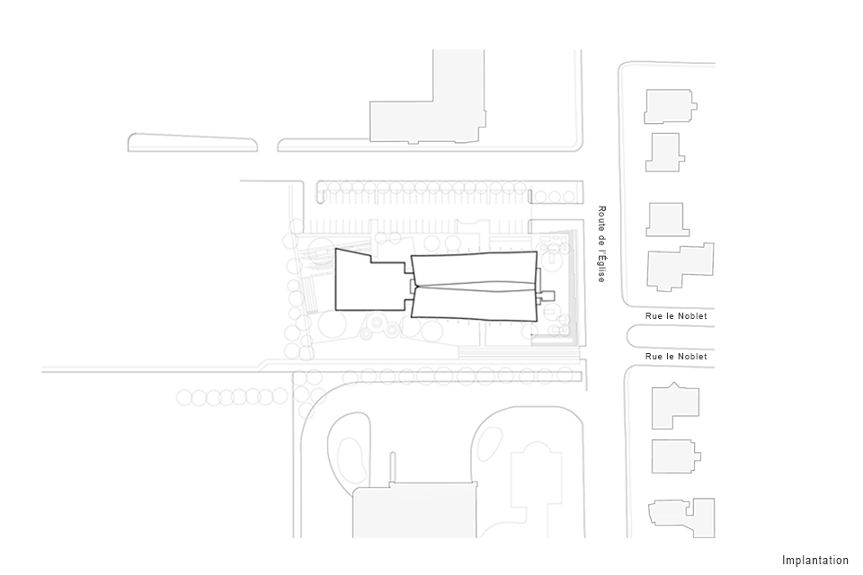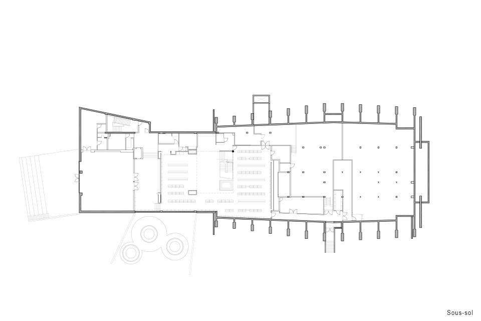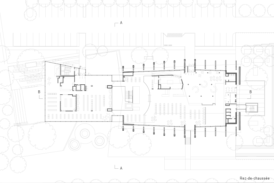 Ainsi, la nouvelle bibliothèque utilise ces « signifiants architecturaux bruts » afin de révéler sa présence sur rue et de souligner son caractère public indéniable. Cet ensemble structuré laisse pénétrer une série de plateformes libres évoluant entre le parvis de la bibliothèque, accroché à l’axe civique à l’est, et le parc à l’ouest, s’infiltrant subtilement dans l’espace de la bibliothèque. De ce mouvement découle l’espace fluide du parvis de l’entrée, de l’accueil et du vide central, dans un cheminement continu, s’ouvrant généreusement sur le jardin protégé au nord et sur les cours encaissées au sud.