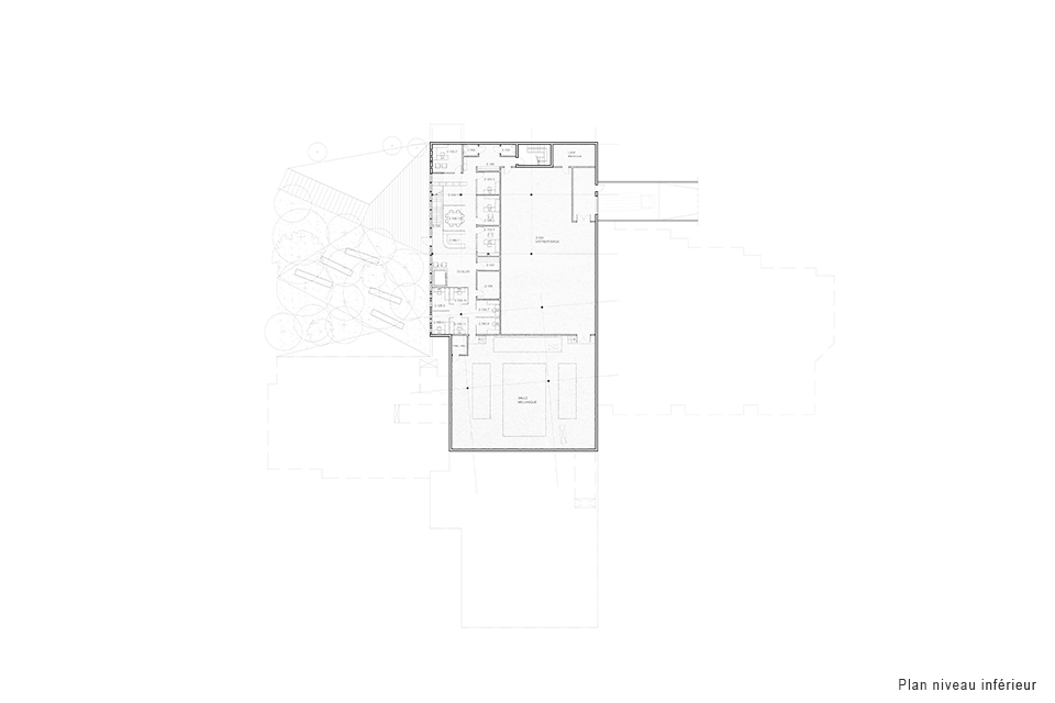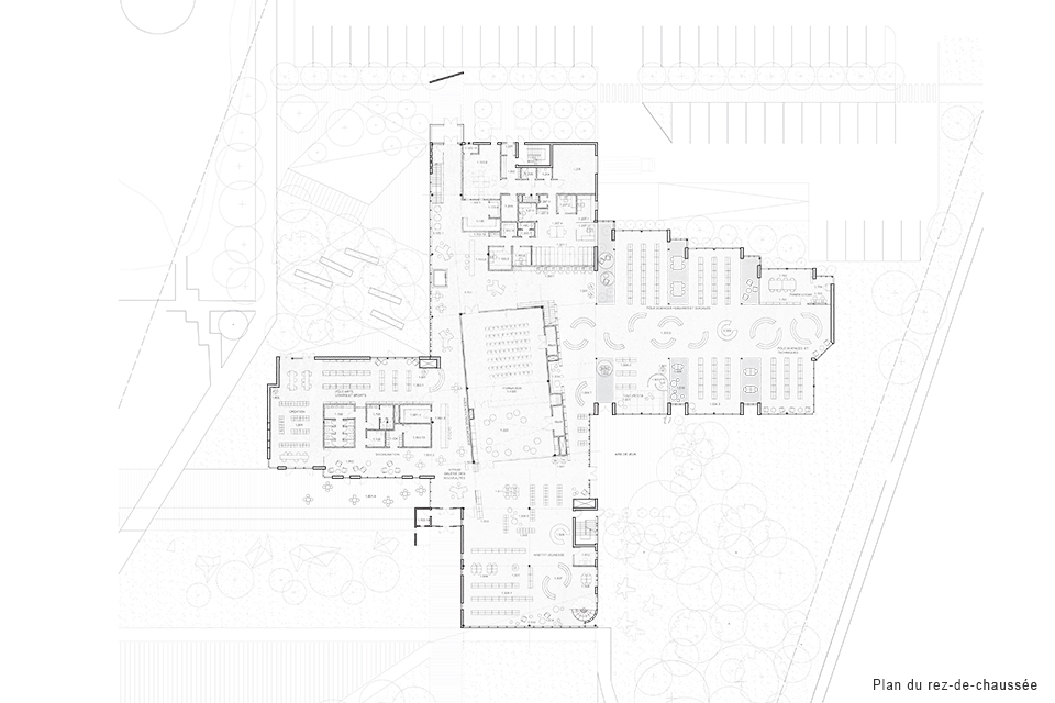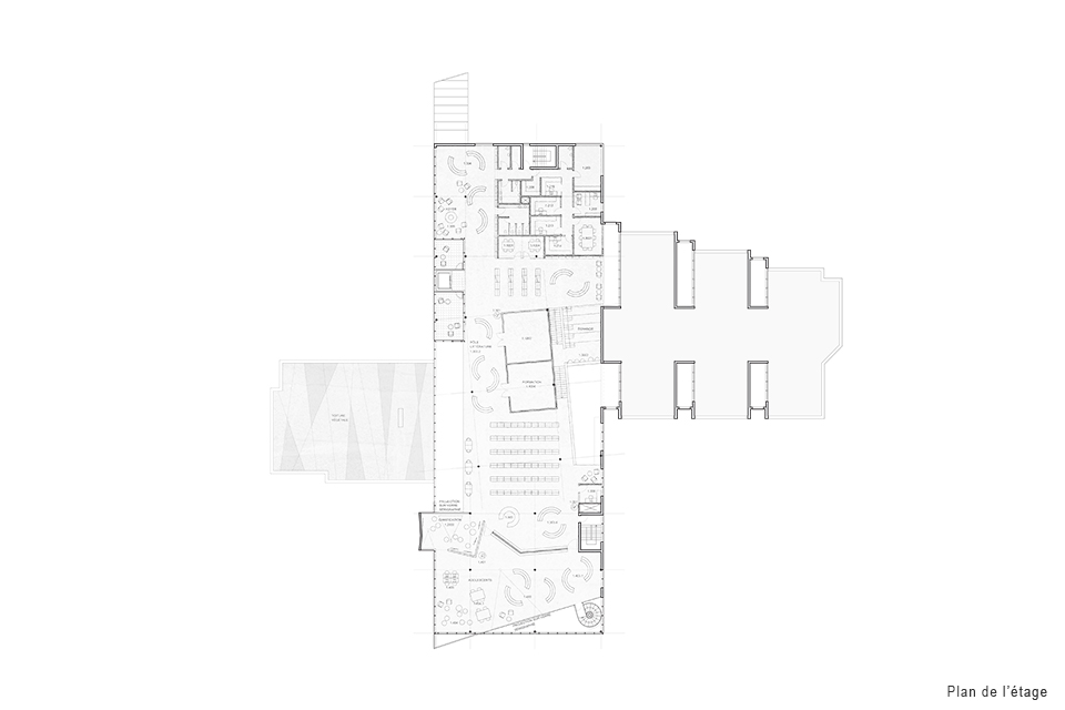 La qualité du mouvement intérieur de la bibliothèque est intimement liée à la découverte spatiale. Au centre de cette figure en croix s’installe la salle multifonctionnelle adossée à la salle d’animation. Ce volume subit une légère rotation de façon à dynamiser et donner une amplitude à la galerie-agora d’un côté et l’escalier-gradins de l’autre. Ces salles peuvent se moduler selon différents types d’occupations ou d’événements. L’emboîtement des deux architectures, existante et nouvelle, se révèle par cet effet rotule du volume central et des vides qui le bordent. Continuité spatiale et percées visuelles s’associent afin de soutenir le mouvement des usagers.