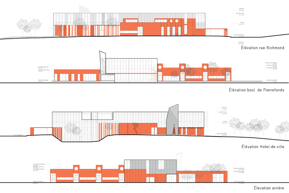 Le projet d’agrandissement de la bibliothèque de Pierrefonds se fonde sur certains principes essentiels. Le premier consiste à concentrer la nouvelle intervention volumétrique dans la portion médiane du bâtiment existant, requalifiant l’entrée actuelle. Une extension, identifiable par son architecture contemporaine épurée, s’installe alors transversalement au bâti existant, de façon à accentuer une présence active sur la rue de Pierrefonds, tout en se prolongeant à l’arrière vers le boisé et le stationnement. Aux points de jonctions avec l’existant, des meneaux et des panneaux de verre et d’aluminium colorés soulignent le prolongement subtil du bâtiment d’origine qui, de part et d’autre de l’intervention, est conservé dans son intégralité, en respect et pérennité de l’œuvre des architectes Rosen Caruso Vescei + Gagnier Gagnon.