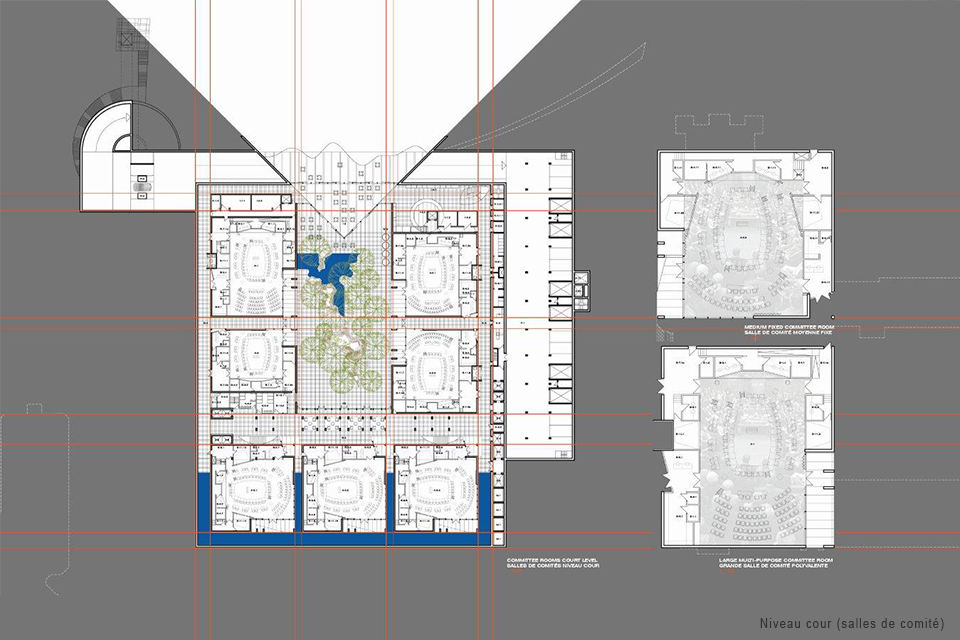 Ce projet complète et rehausse l’ensemble du patrimoine bâti de la Colline Parlementaire par une intégration sensible et symbiotique de l’architecture au paysage. Ce nouveau bâtiment – le premier à être érigé sur le site de la Colline Parlementaire depuis 80 ans – accueille douze salles de comités à la fine pointe de la technologie regroupées autour d’une cour extérieure.