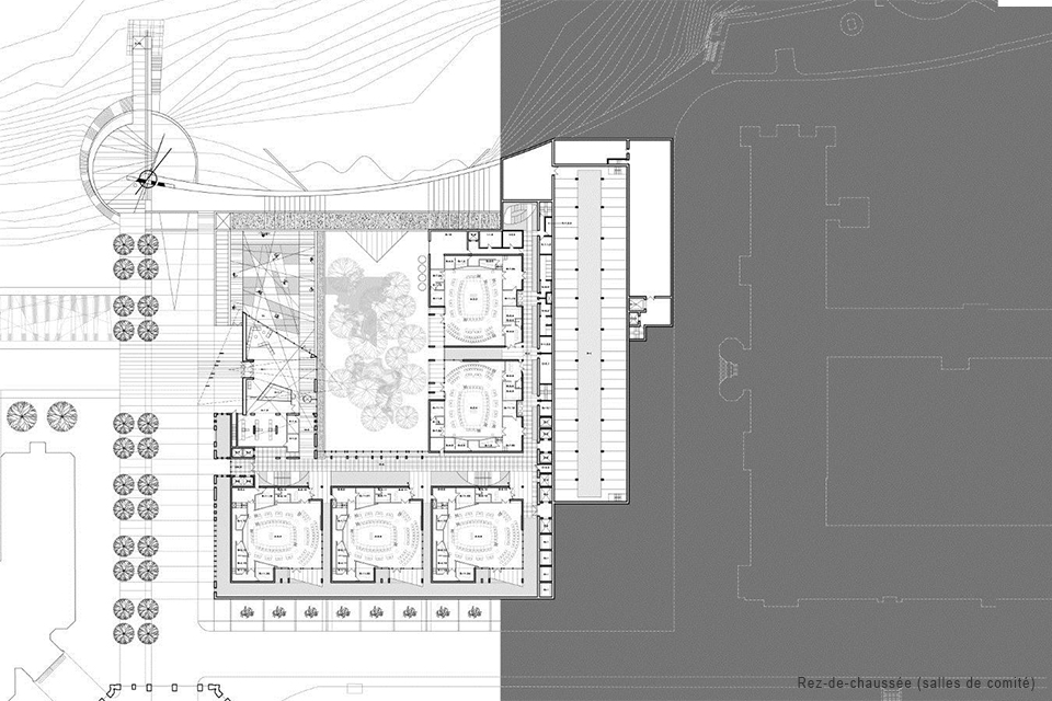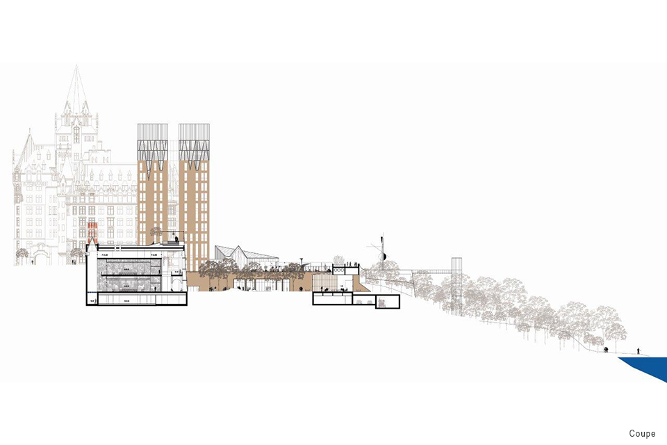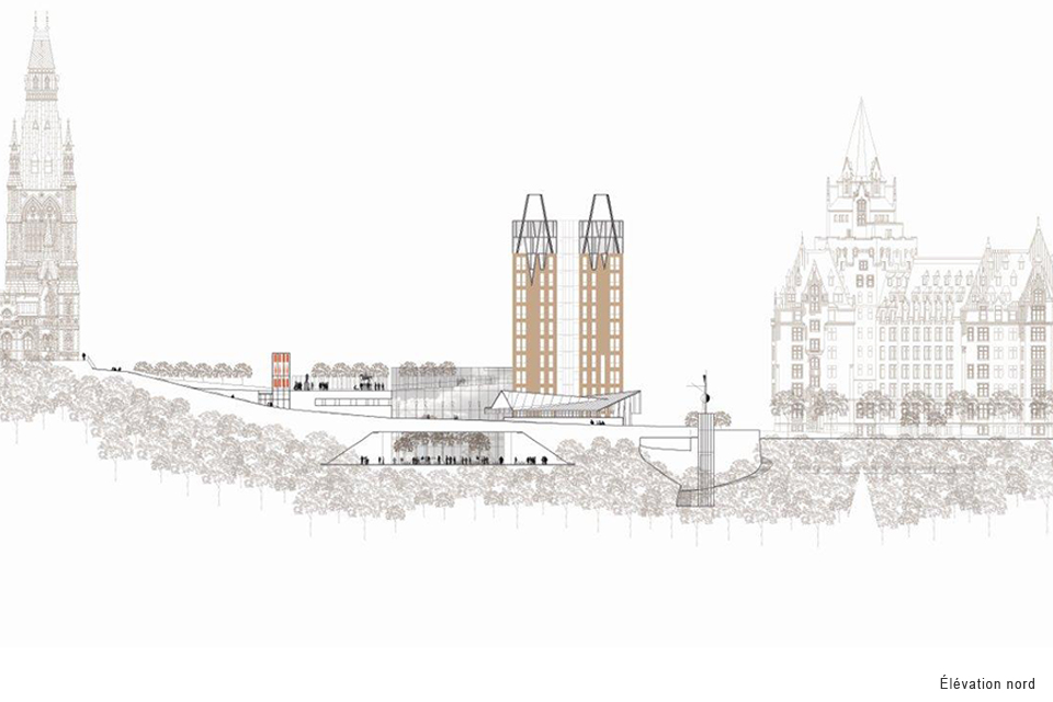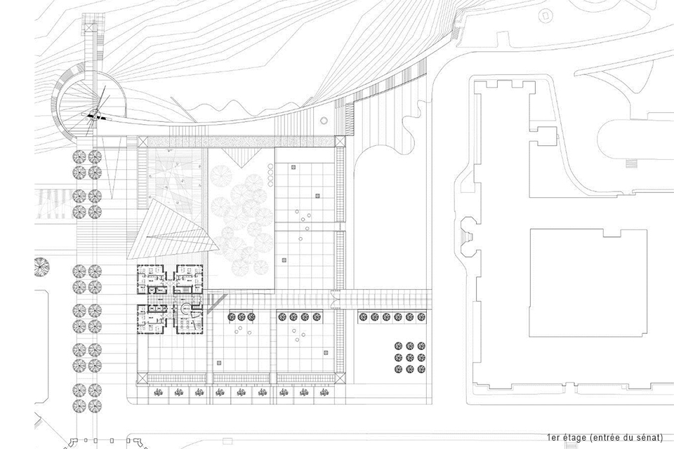 Le projet, qui contient également un café, un espace d’exposition, un centre logistique souterrain hautement sécurisé ainsi qu’un stationnement robotisé, se démarque par l’élévation d’une tour de 10 étages logeant les bureaux du Sénat signalant la présence du nouveau complexe, dont l’architecture et la verticalité réinterprètent dans un langage contemporain l’image historique des tours avoisinantes et créent un dialogue avec elles.