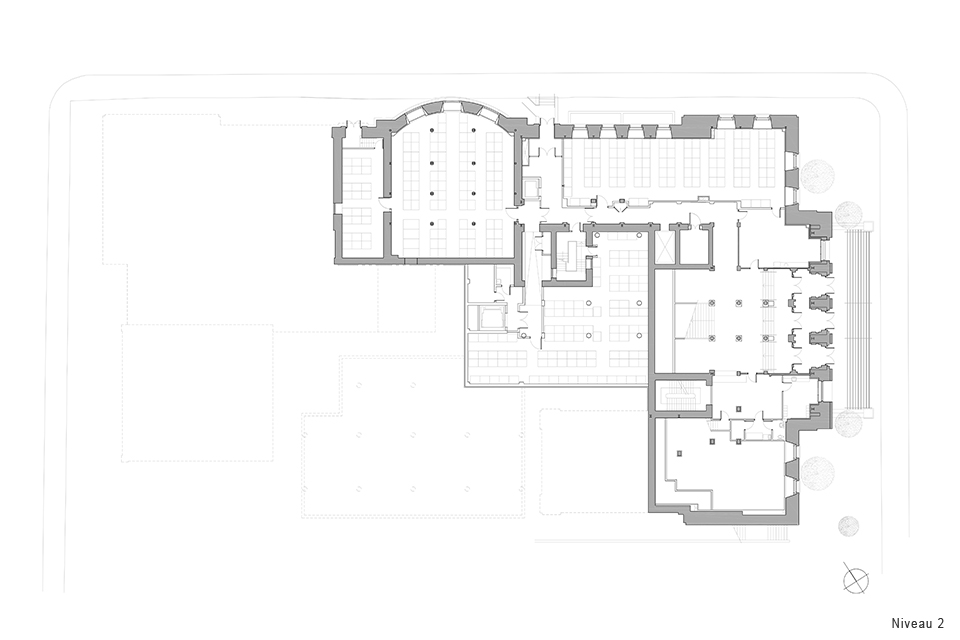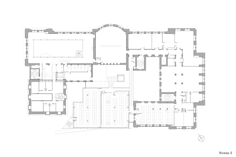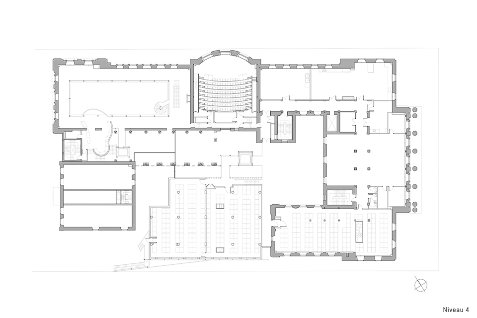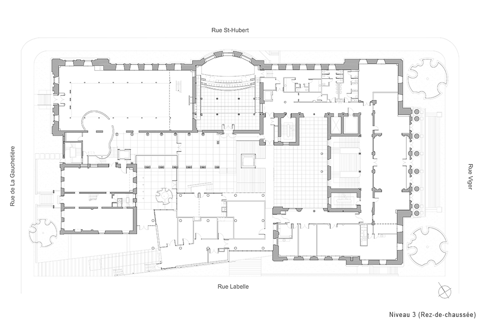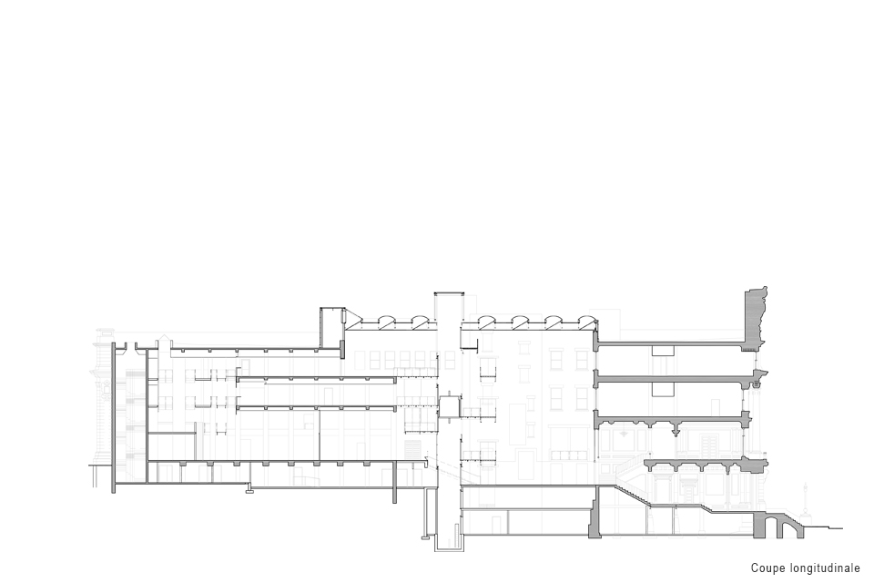 C’est sur ces paramètres de base que nous avons conçu le parti architectural du Centre d’Archives de Montréal. Il se fait autour de l’axe principal longitudinal, et se développe à partir de deux espaces verticaux; un atrium intérieur et une cour extérieure contenue par la volumétrie. Le travail architectural se focalise quand à lui sur l’exploitation des matériaux existants, pierre, moellon, brique et plâtre, en rapport constant avec des matériaux contemporains tels que l’aluminium strié, le métal perforé et le verre.