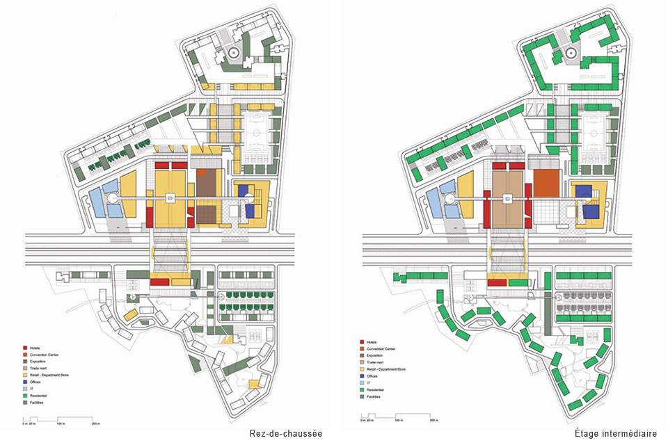 Le site du projet est divisé par l’autoroute en deux parties inégales et possède une dénivellation de 20m orientée vers le sud. Plutôt que de considérer cette séparation comme un défaut, nous croyons que par ce geste fort, il est possible d’unifier et de dynamiser le complexe en entier. D’autre part, une attention particulière a été accordée aux bâtiments résidentiels afin de créer une typologie particulière. De même que des espaces et des vues, qui définissent l’identité des quartiers et servent de point de repère aux gens qui y habitent. Durant la phase de conception nous avons établis les priorités suivantes s’appliquant au développement du plan d’urbanisme :