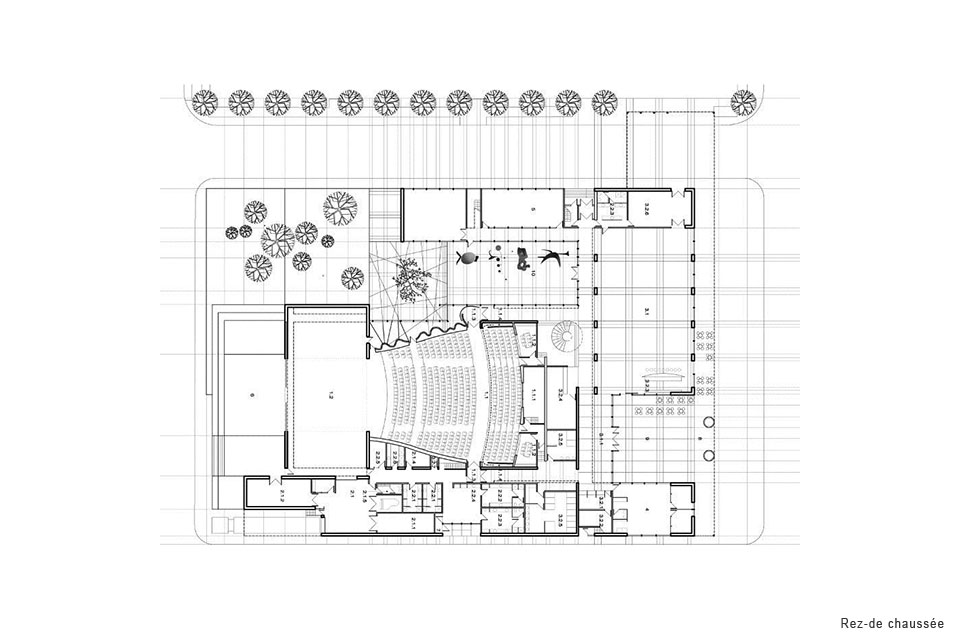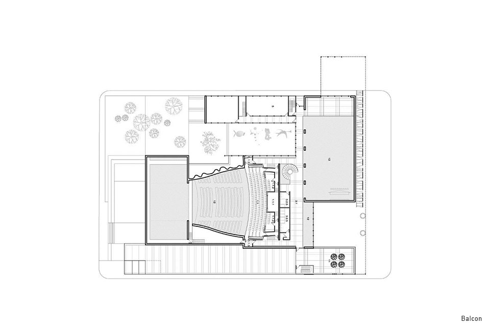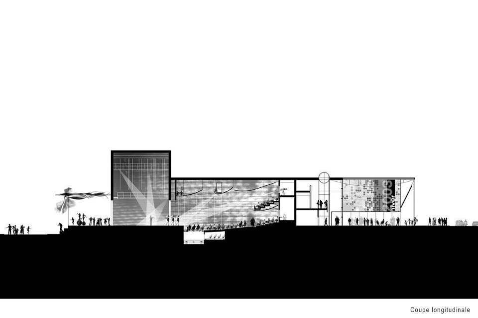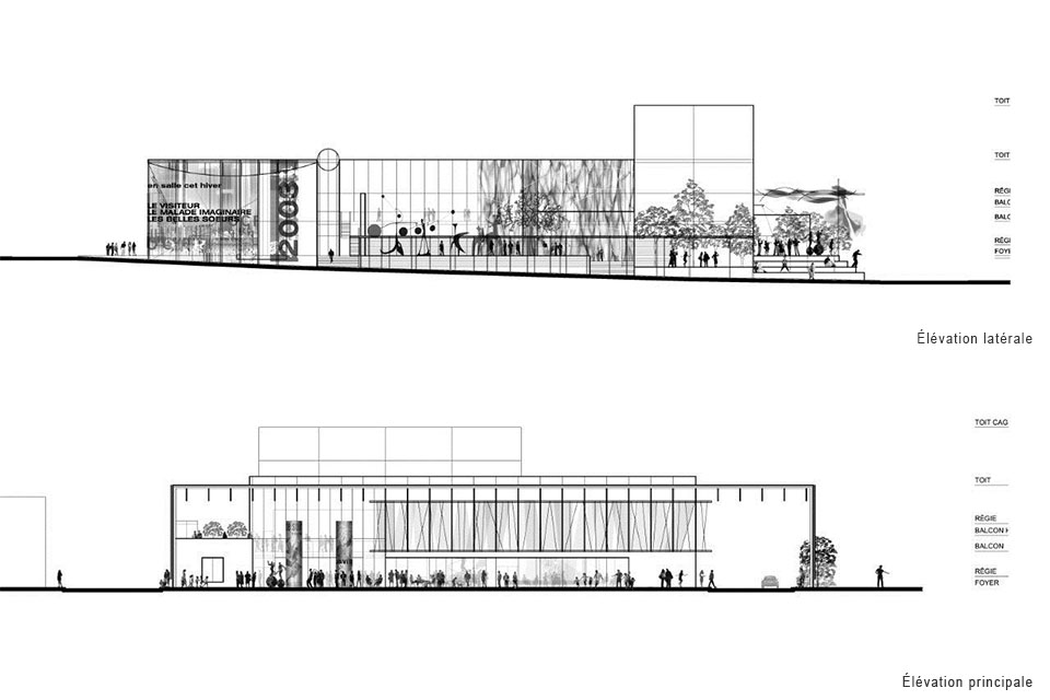Cette institution de prestige qui abrite une salle de théâtre de 900 places et un cabaret de 300 places émerge du contexte particulier de la ville de Saint-Hyacinthe où l’urbain s’enrichit de la présence d’un cours d’eau et de tout l’aspect ludique qu’il engendre. Par sa générosité spatiale, le parvis du théâtre, tourné vers la ville, crée une nouvelle place urbaine renforçant un réseau existant d’espaces publics. Cette approche au bâtiment, cérémonielle et en accord avec le centre civique, le marché et les rues commerciales, reflète le statut de l’institution dans la ville. Une arche élancée est également formée par le rabattement du toit du théâtre créant ainsi une porte d’entrée vers un territoire ludique et culturel au cœur de la ville de Saint-Hyacinthe. Côté rivière, un second pôle d’activité s’adresse à la présence de la nature par l’aménagement d’une scène extérieure débordant vers une esplanade inclinée paysagée qui se greffe au parc linéaire longeant la rivière Yamaska.