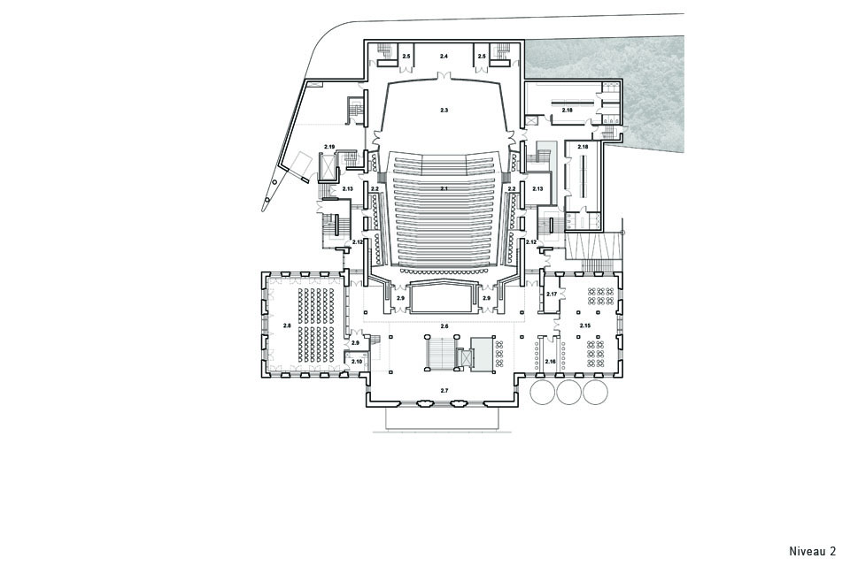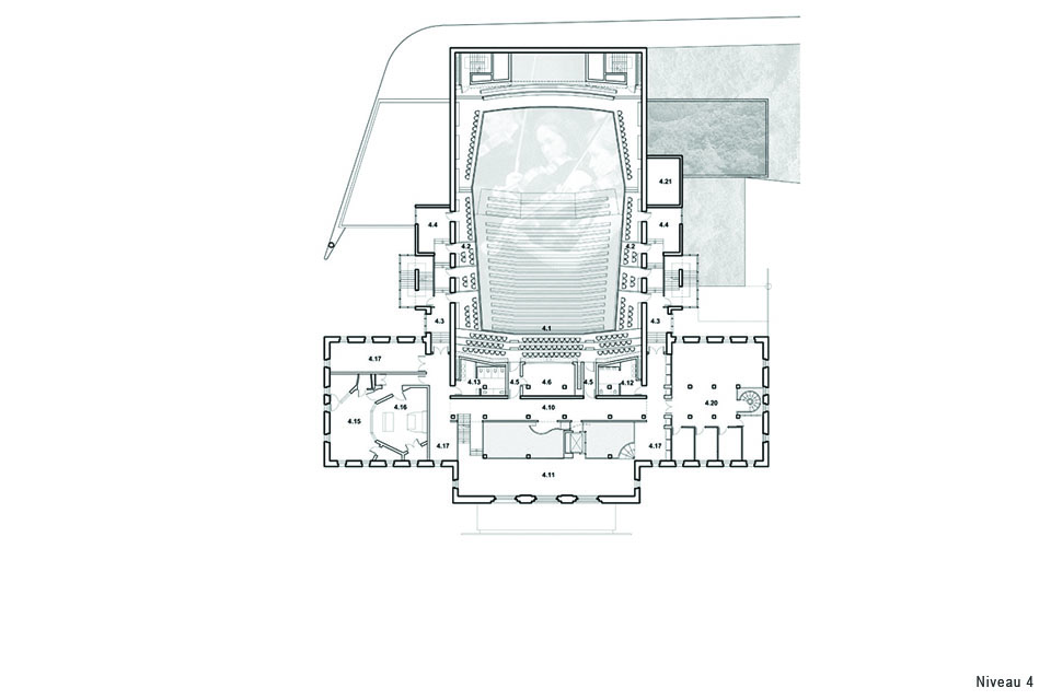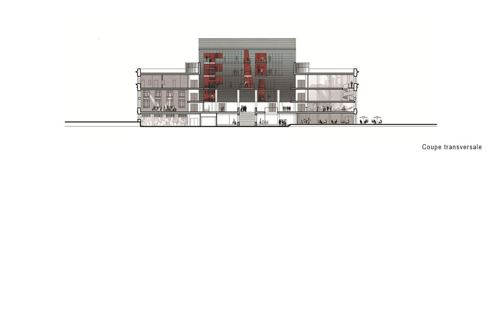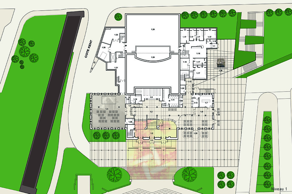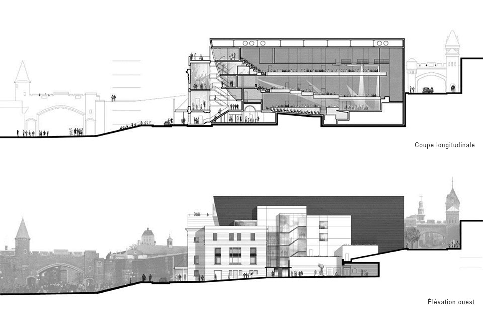 Participant au projet de développement de la « coulée verte », le Palais Montcalm devient le lieu culturel majeur. Un espace public inédit est révélé; la Cour. La principale intervention en façade constitue la mise en place d’un grand plan de verre à transparences variables et à teneur signalétique renforçant la frontalité de la salle de concert sur la grande place. Le volume de la nouvelle salle de concert de la « Maison de la musique de la Capitale nationale » devient l’élément référentiel de la composition urbaine d’ensemble qui affirmera sa présence dans la ville par son rapport au « lointain ».