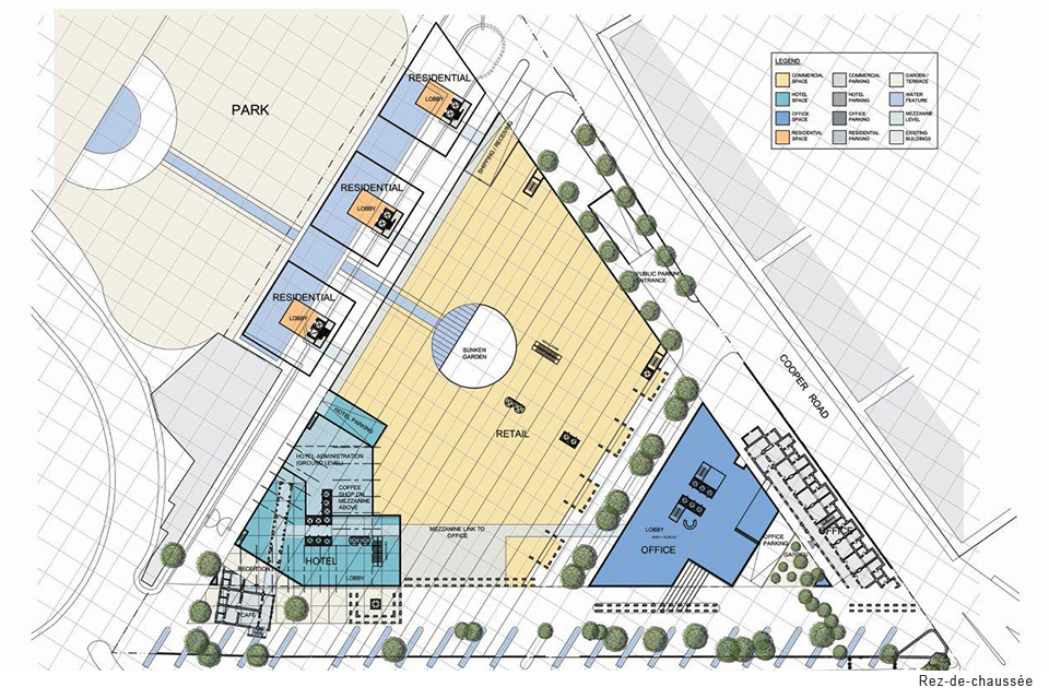Un centre commercial sur 5 niveaux avec des restaurants, cinémas etc. reliant tout le complexe et directement accessible du stationnement logeant plus de 2,400 voitures.