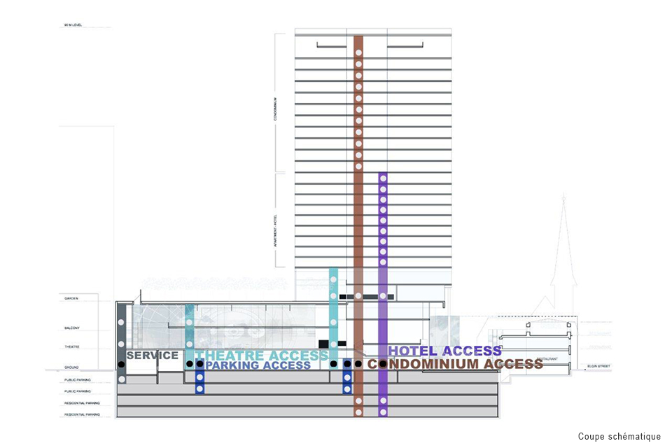 Neuf étages d’appart-hôtels coiffent le théâtre, offrant 140 suites de tailles diverses. Deux niveaux sous ce dernier logent un centre d’affaires et des salles de réception s’ouvrant sur le toit-terrasse. Le projet culmine dans une tour résidentielle de 11 niveaux accueillant de 74 condominiums dont plusieurs penthouses sur deux niveaux occupant les étages supérieurs.