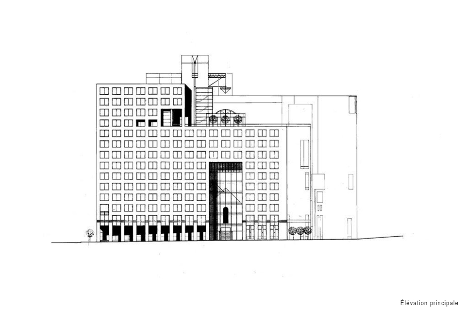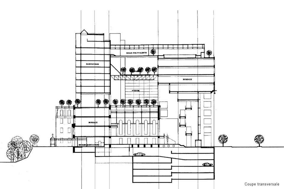 Cette intervention de prestige se lit comme étant un seul bâtiment aux fonctions multiples, constitué par trois pôles principaux: un nouvel espace à bureaux avec entrée sur le Boulevard René-Lévesque; les habitations au-dessus de l’ensemble conventuel, réaménagé en bureaux; un atrium central qui unit l’ensemble. L’atrium est le point focal de l’ensemble, il assure le dialogue entre ses différentes parties et assure les qualités d’ouverture du projet et l’apport direct de lumière. Les différents éléments sont relevés avec préciosité par la découverte, la surprise et la mise en valeur du détail architectural.
